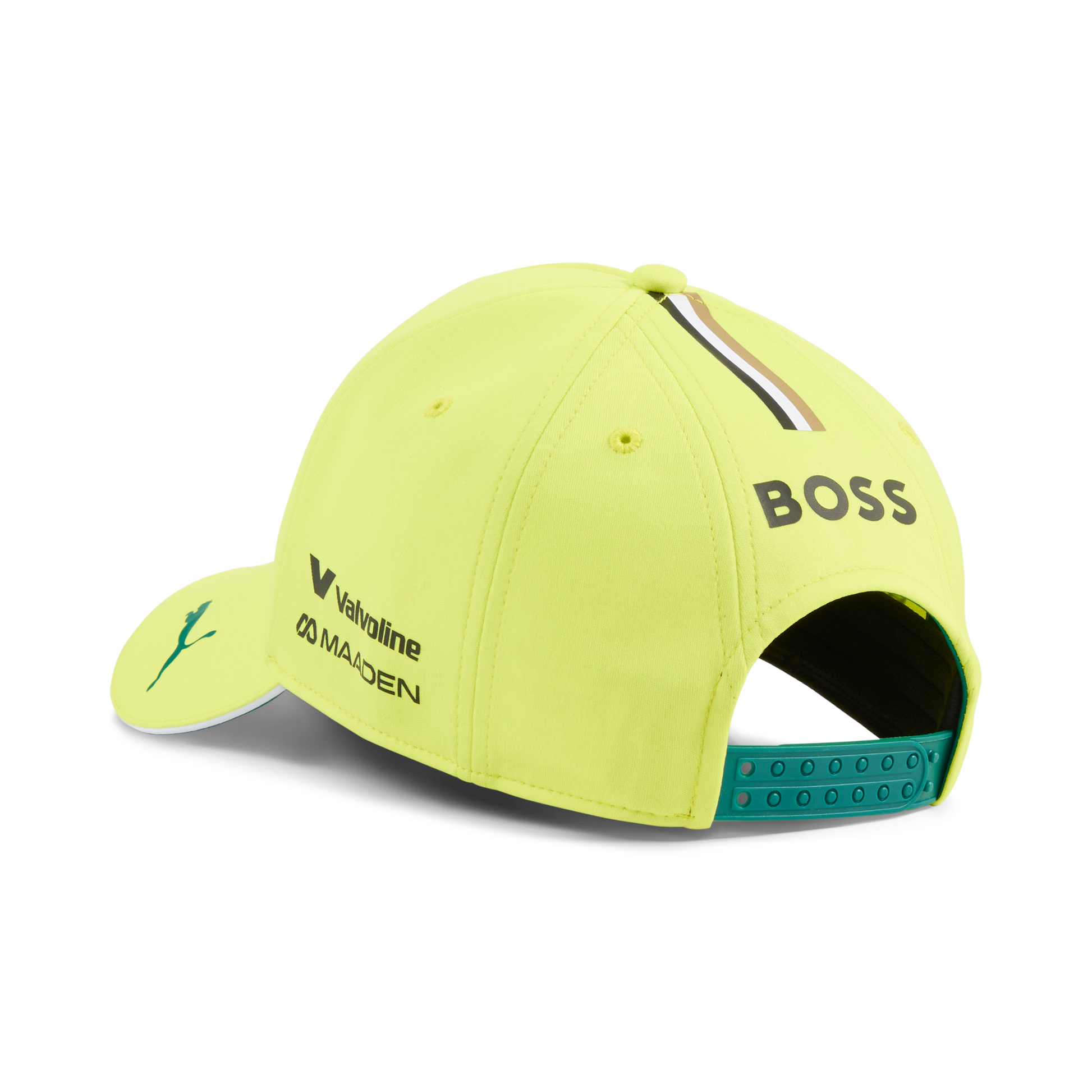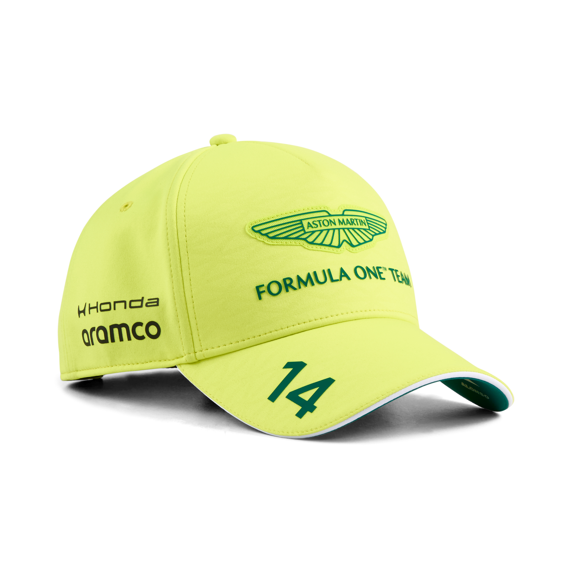 Support Fernando Alonso in style with the Aston Martin F1 Team 2026 Alonso Baseball Cap in Lime Shimmer. This unisex cap features a curved peak, adjustable strap, and official Aston Martin Formula One Team and Alonso branding, offering a comfortable fit and bold motorsport look. Perfect for race days, casual wear, or showing driver support.