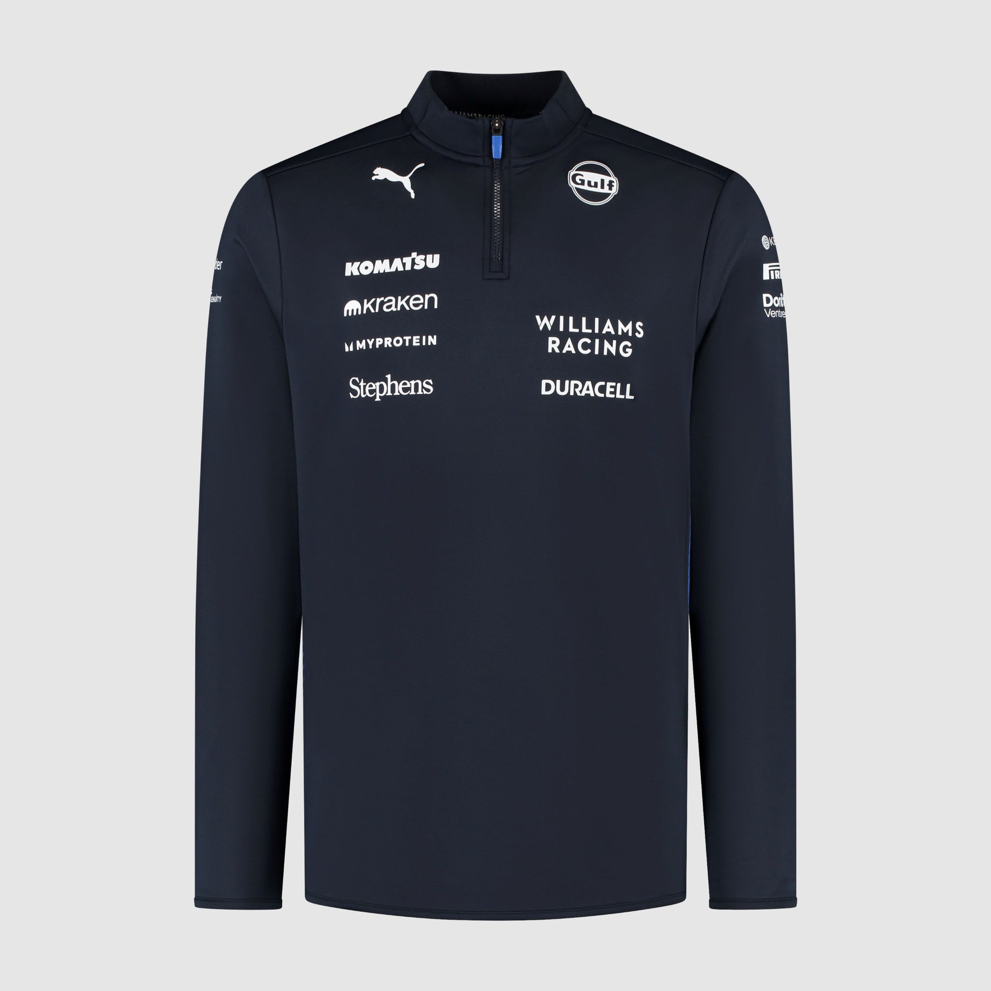 Official F1 2025 Williams Racing quarter zip sweater. Versatile sweater that can be worn on its own, with a tee shirt or collared shirt. Get the team principal look with the Williams Formula One Team 1/4 zip. Team and partner logos finish the look.