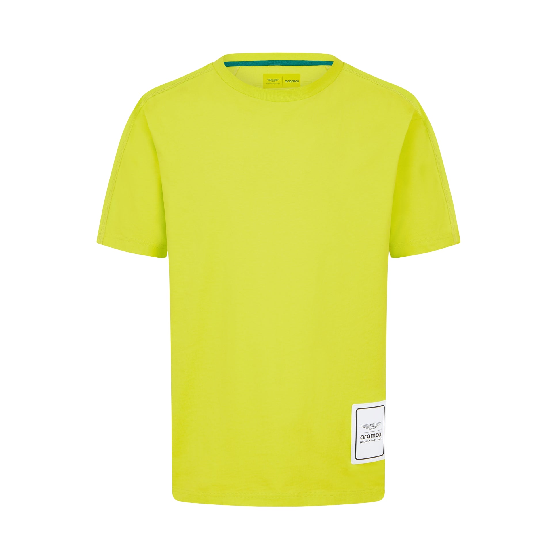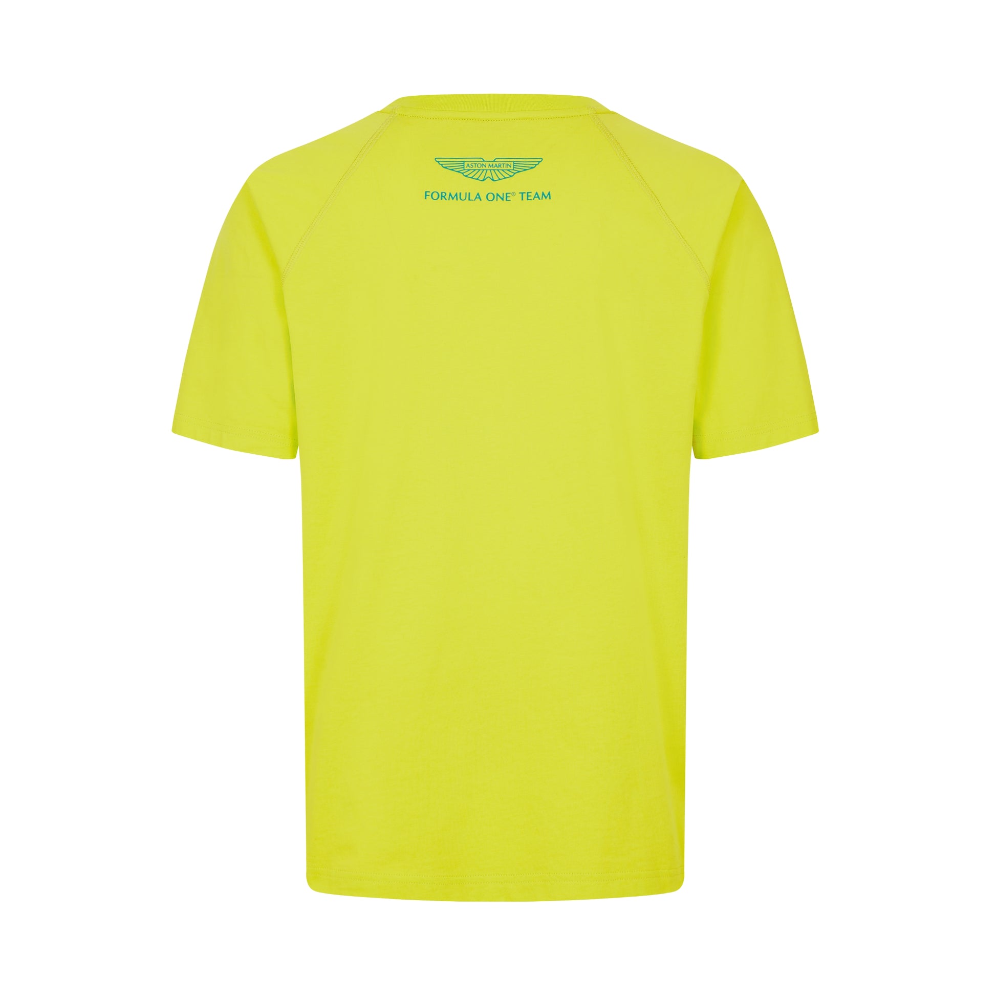 Classic crew neck AMF1 tee shirt with Aston Martin Aramco F1 Team front patch and Aston Martin Wings graphic on the back. Available in Team Green, Lime or White. Made from Organic Cotton