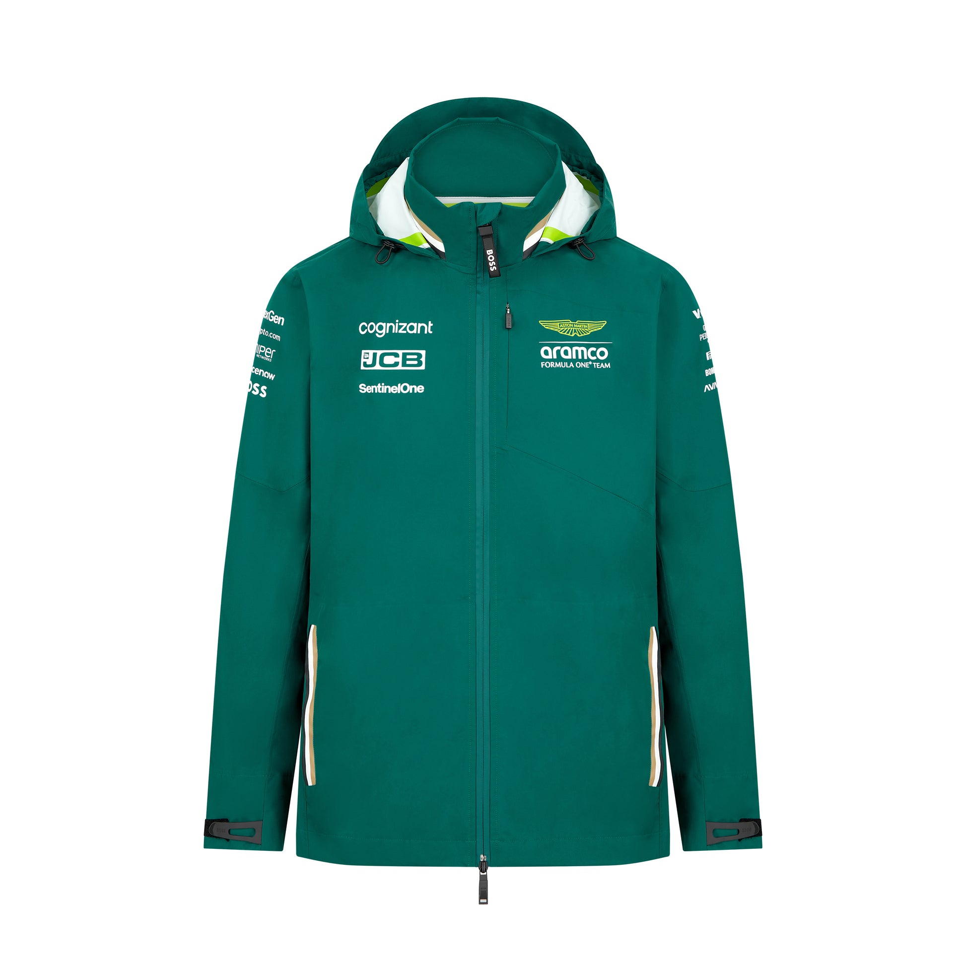 5K / 5K Rainproof AMF1 Jacket with a packaway hood and adjustable cuff fastenings. Finished in Team Green with team and partner logos. As worn by the Aston Martin Aramco F1 Team during the 2024 F1 World Championship. BOSS stripe branding around the neck and hood.