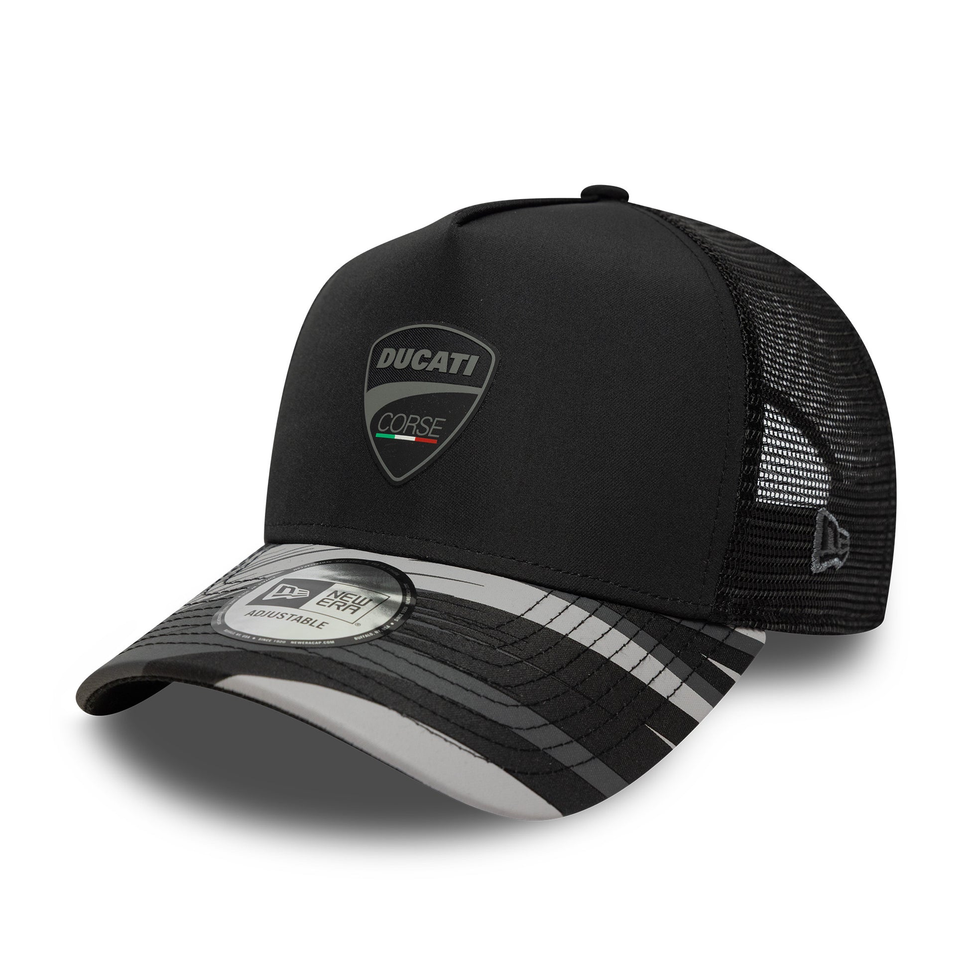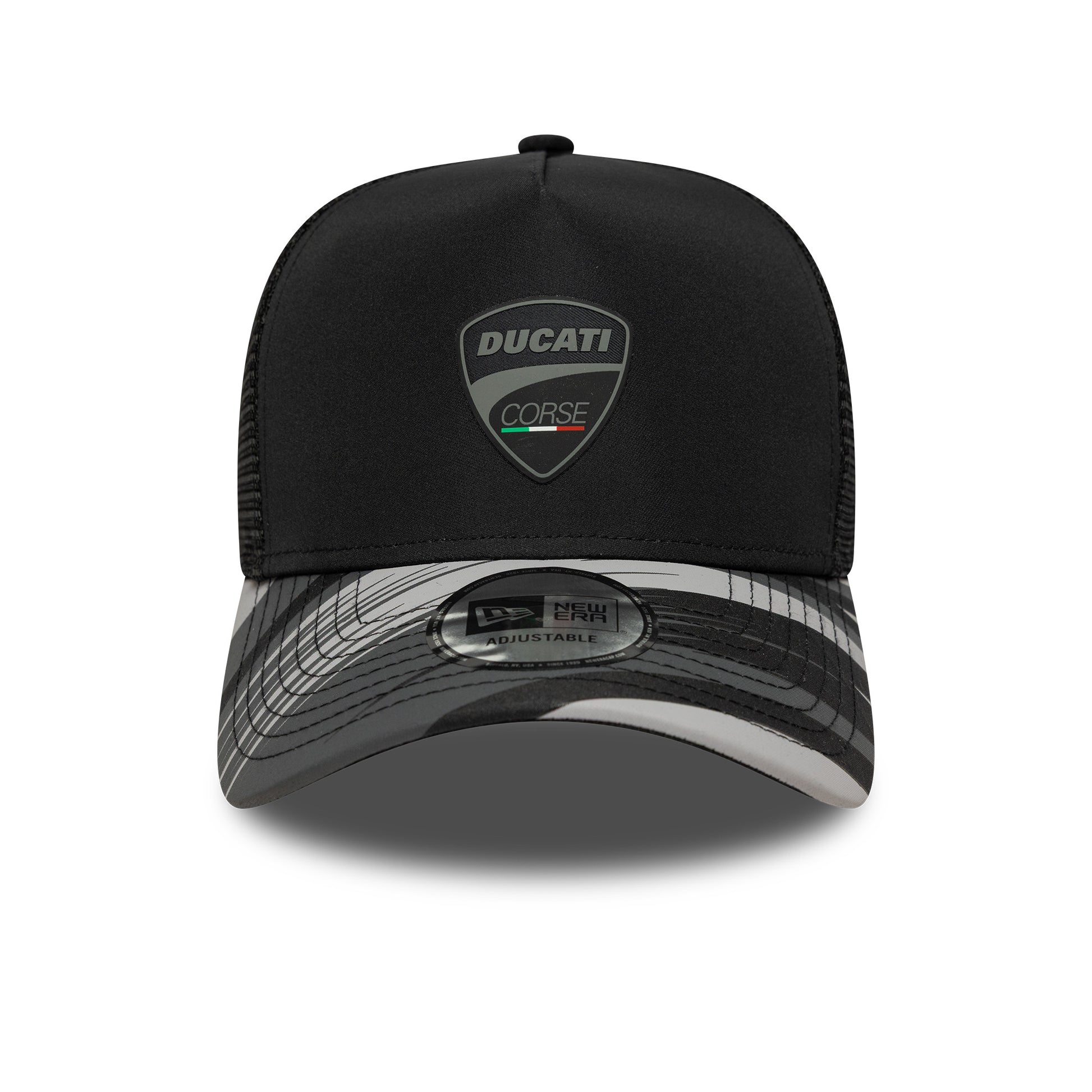 The Ducati Motor Logo Print Black A-Frame Trucker Adjustable Cap features bold Ducati styling with a Ducati Motor logo on the front and a structured A-Frame crown.