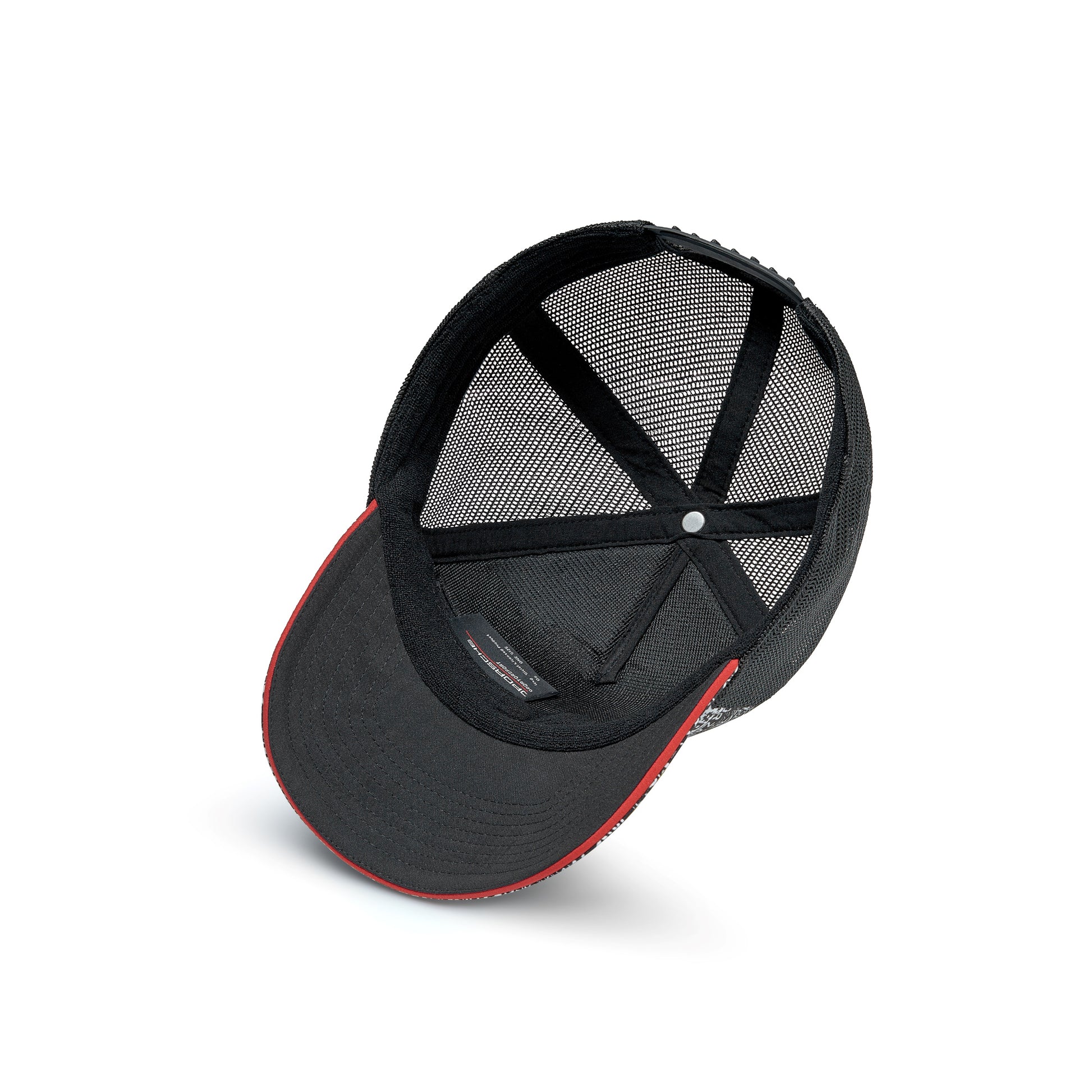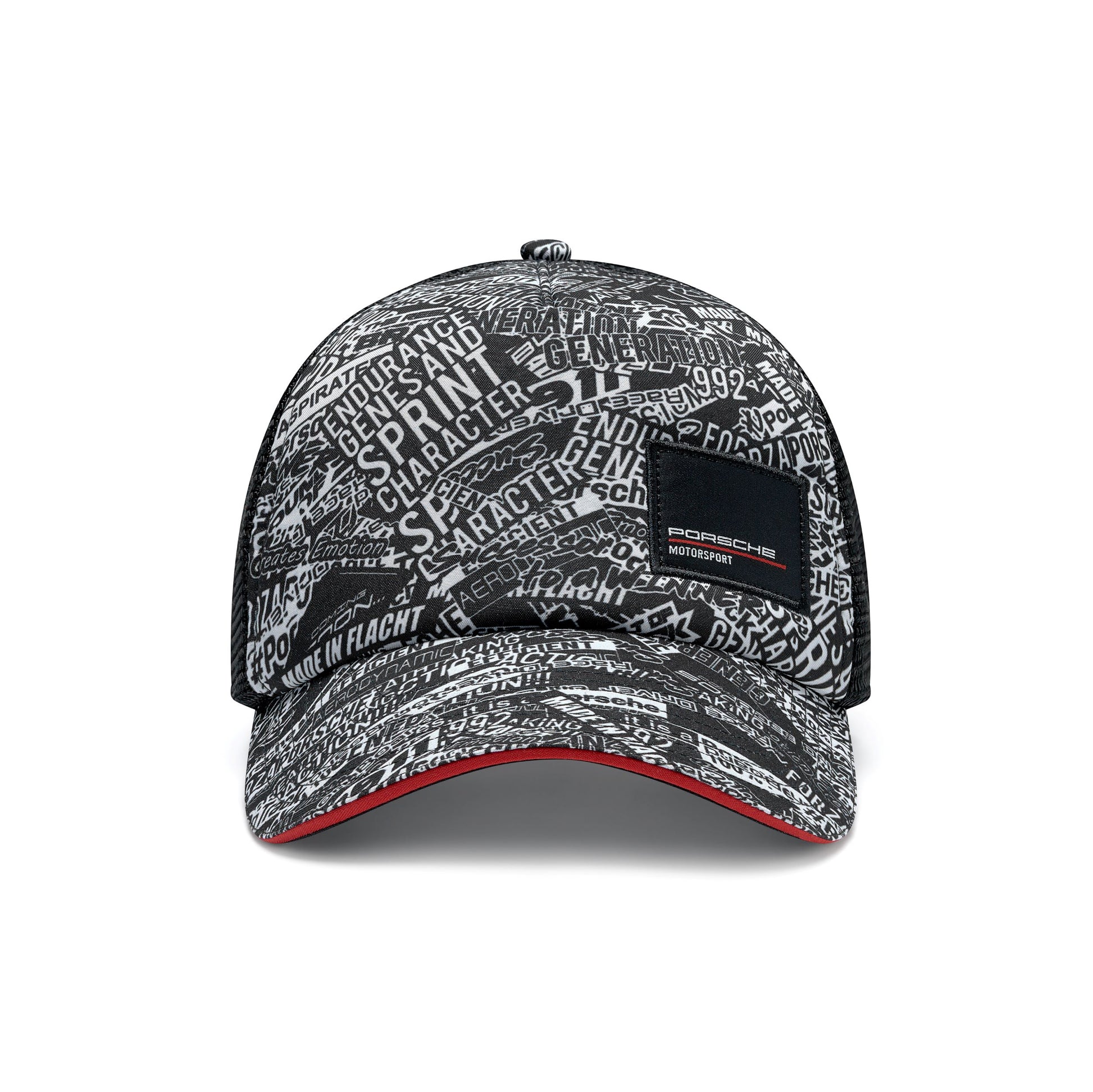 Bold Quoted All Over Print Cap from Porsche Motorsport. With small Porsche Motorsport badge, this one has a lot to say for itself! Black mesh trucker style and snap closure and a contrast red sandwich peak