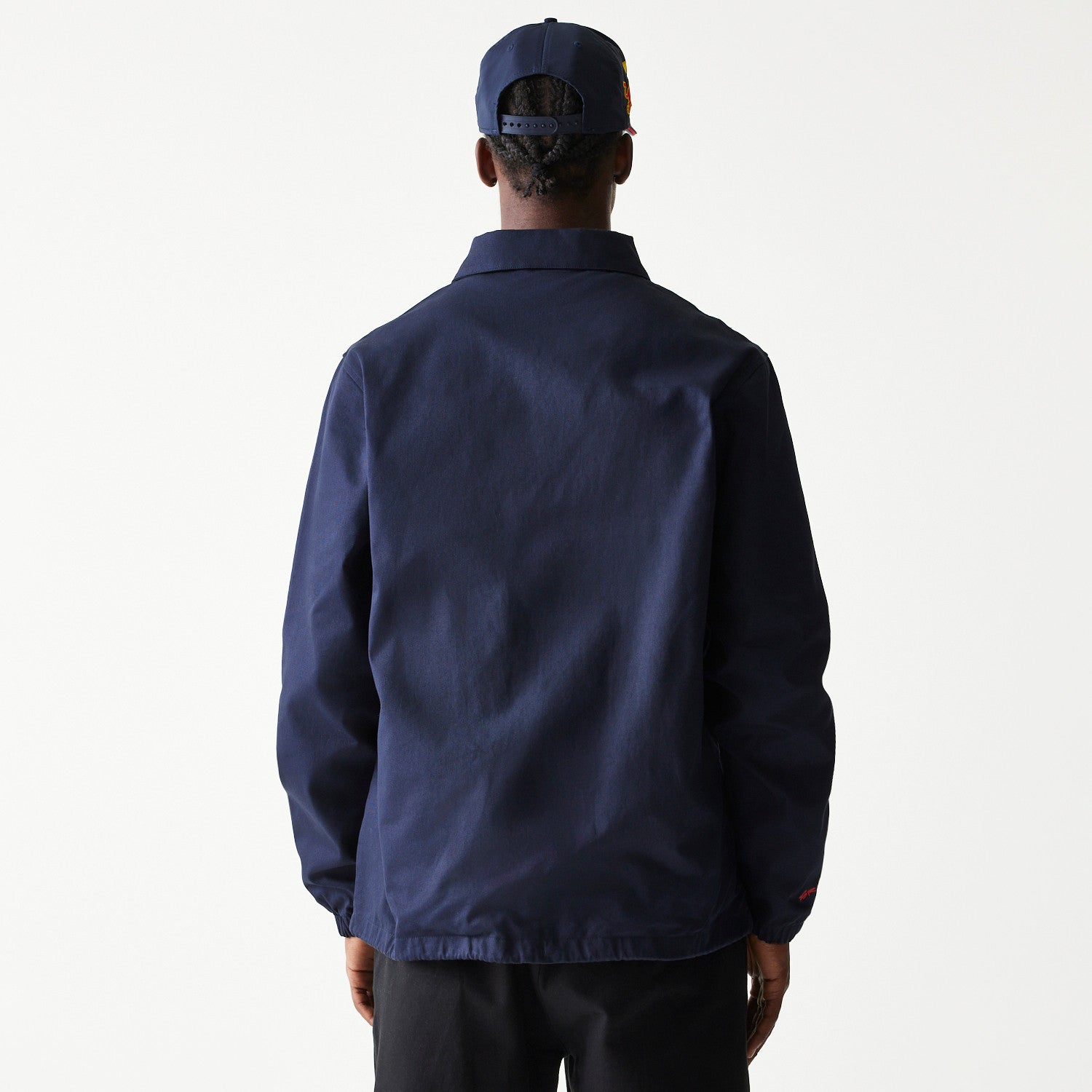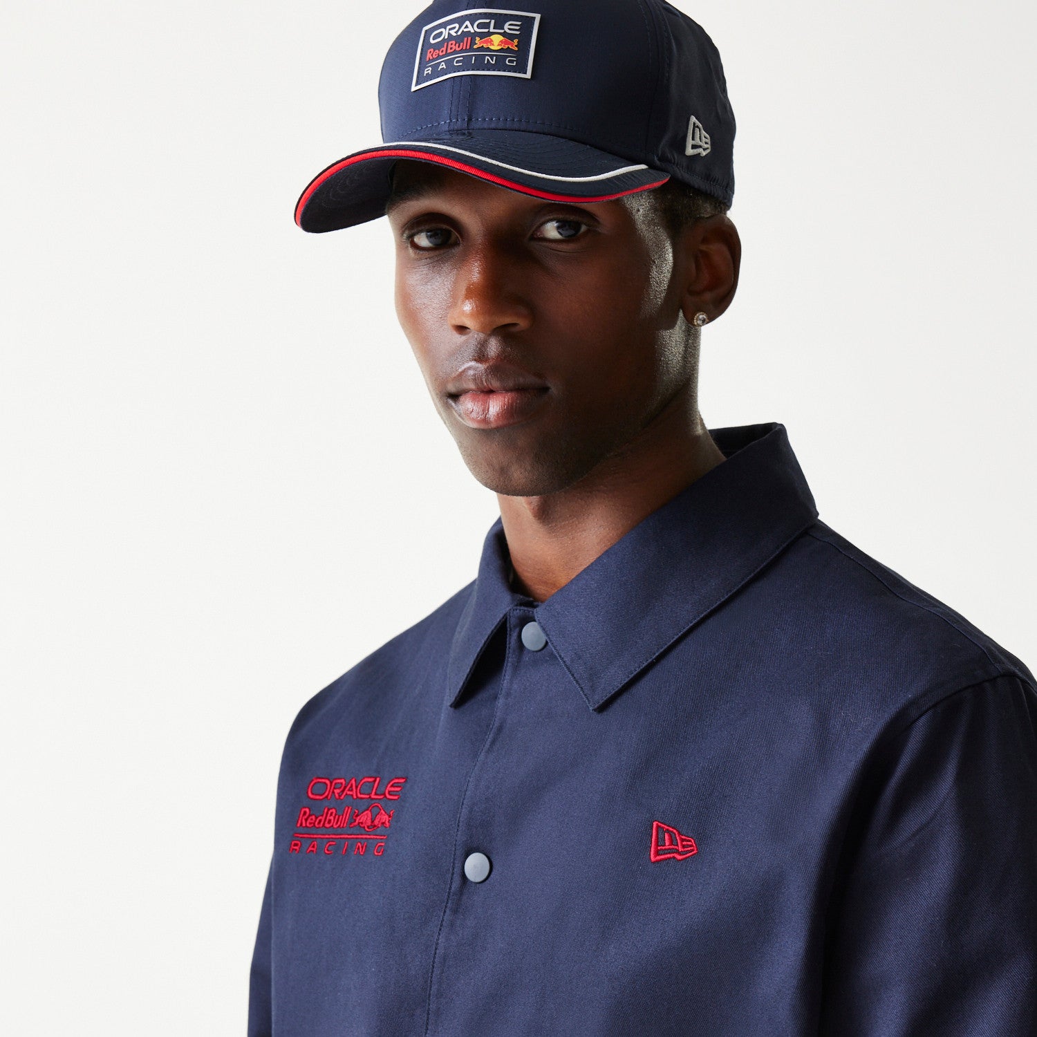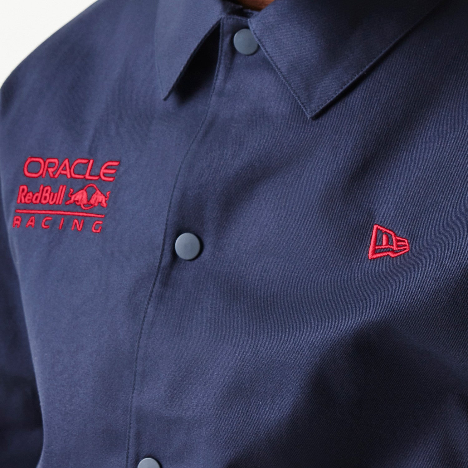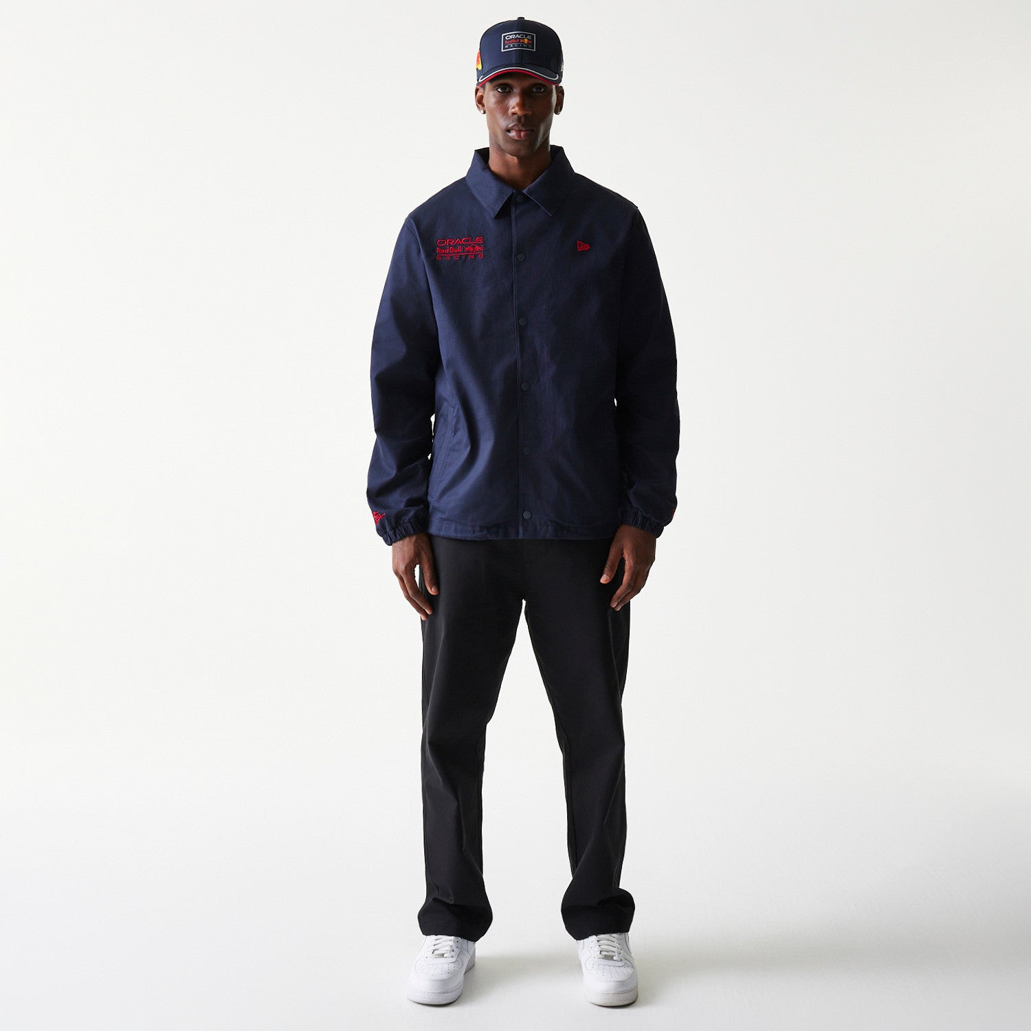 Classic Coach Jacket design from Red Bull F1 Team. Available in navy or a bolder blue with all over print design. Small Oracle Red Bull Racing Team logo and New Era flag logo sit on either side of the chest.