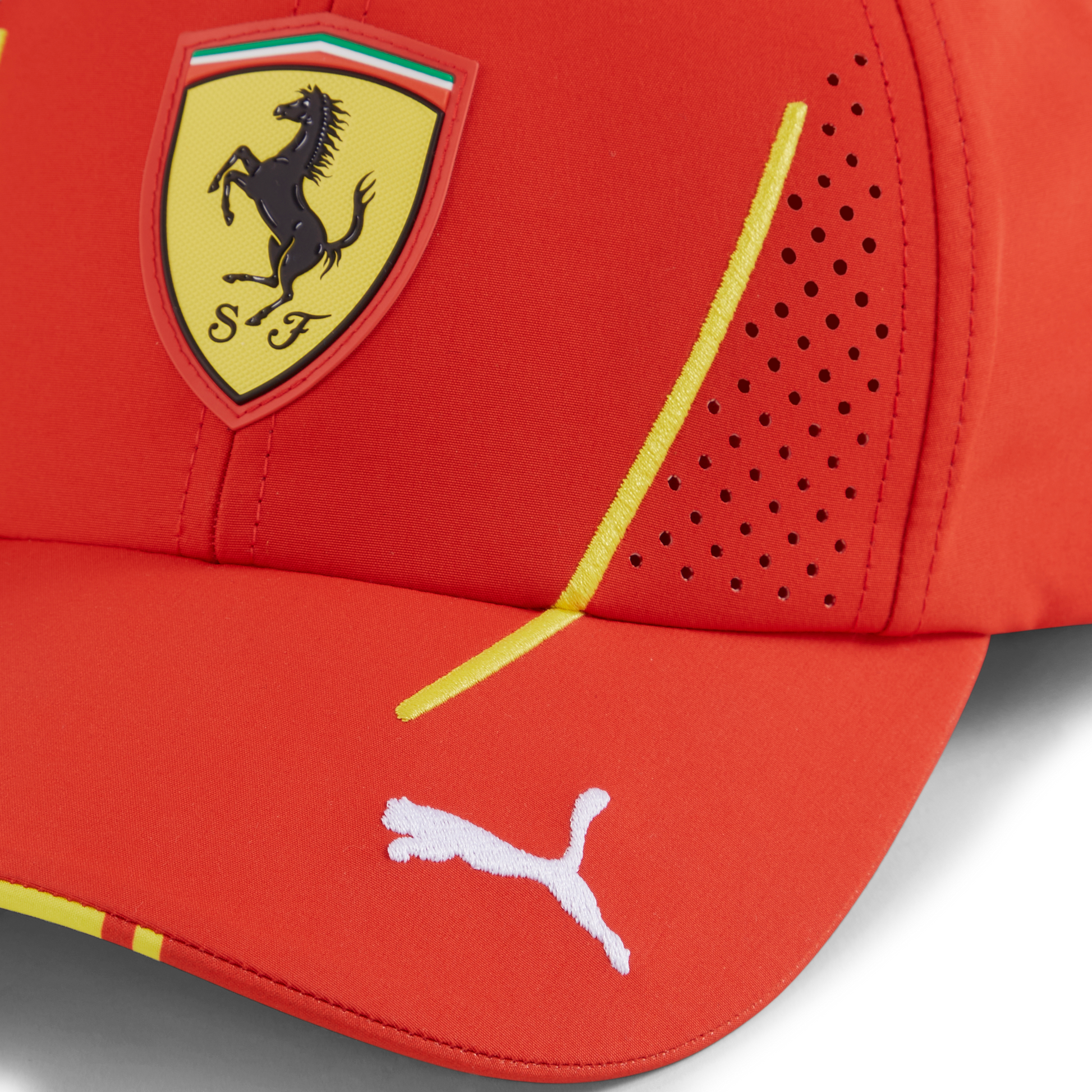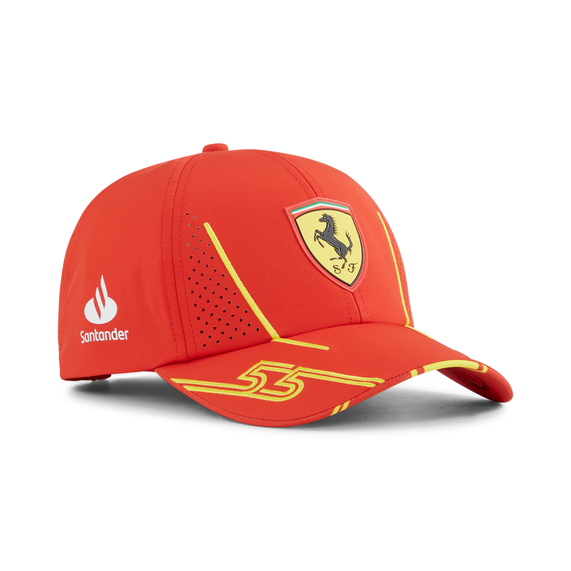 Official Charles Leclerc cap for kids. Features team logo, driver logo and number on the underneath of the peak, which is finished in the native Monaco flag colours. As worn by Charles during the 2024 Formula 1 season (in adult size)