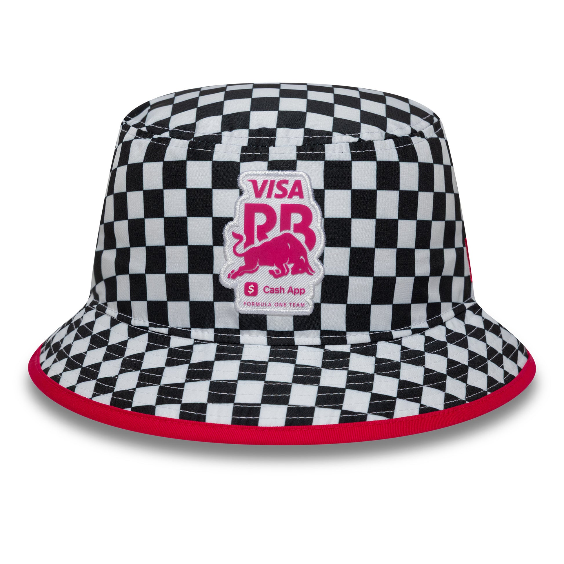 The Visa Cash App Racing Bulls Checkerboard Tapered White Bucket Hat combines sporty style with casual comfort.
