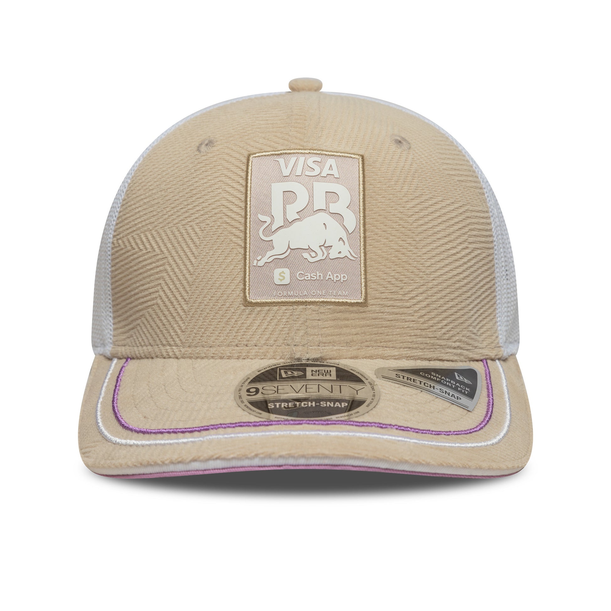 Visa Cash App Racing Bulls Miami Edition Cap. Finished in tan and lilac. As worn by the VCARB Team during the 2025 F1 World Championship