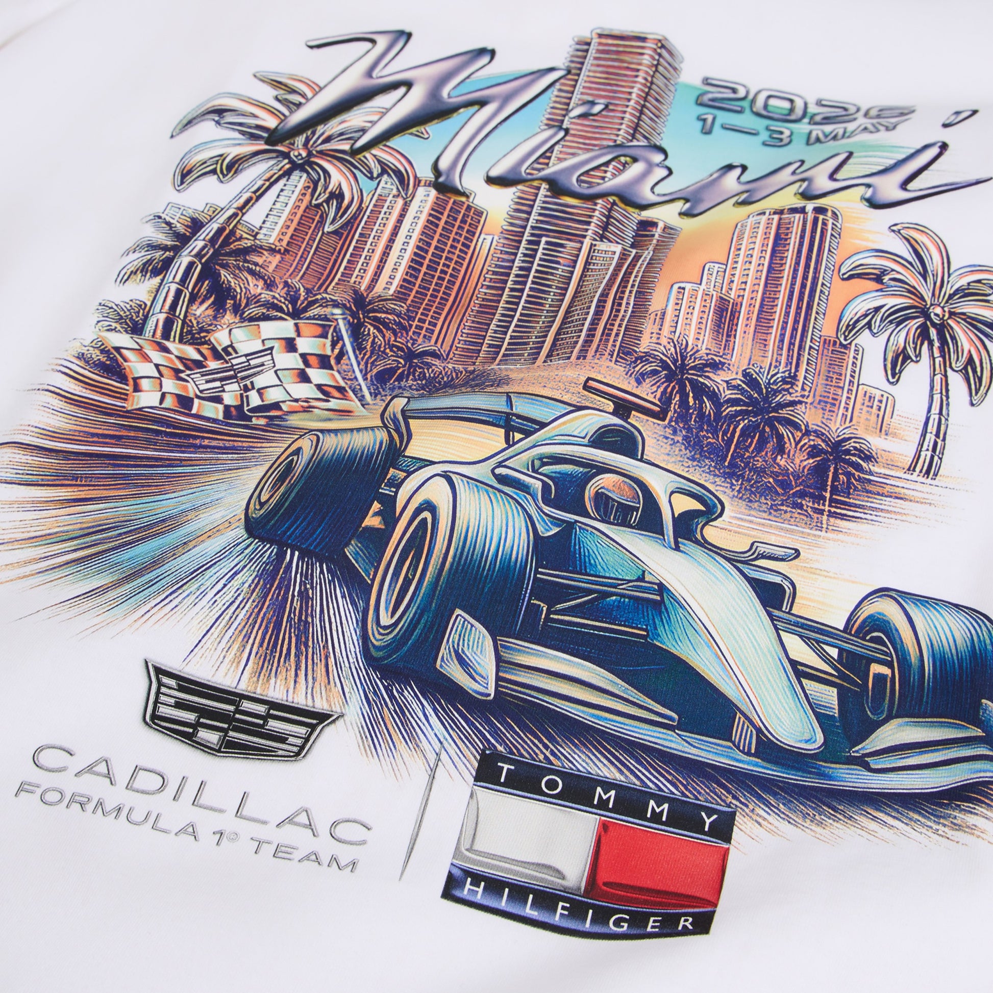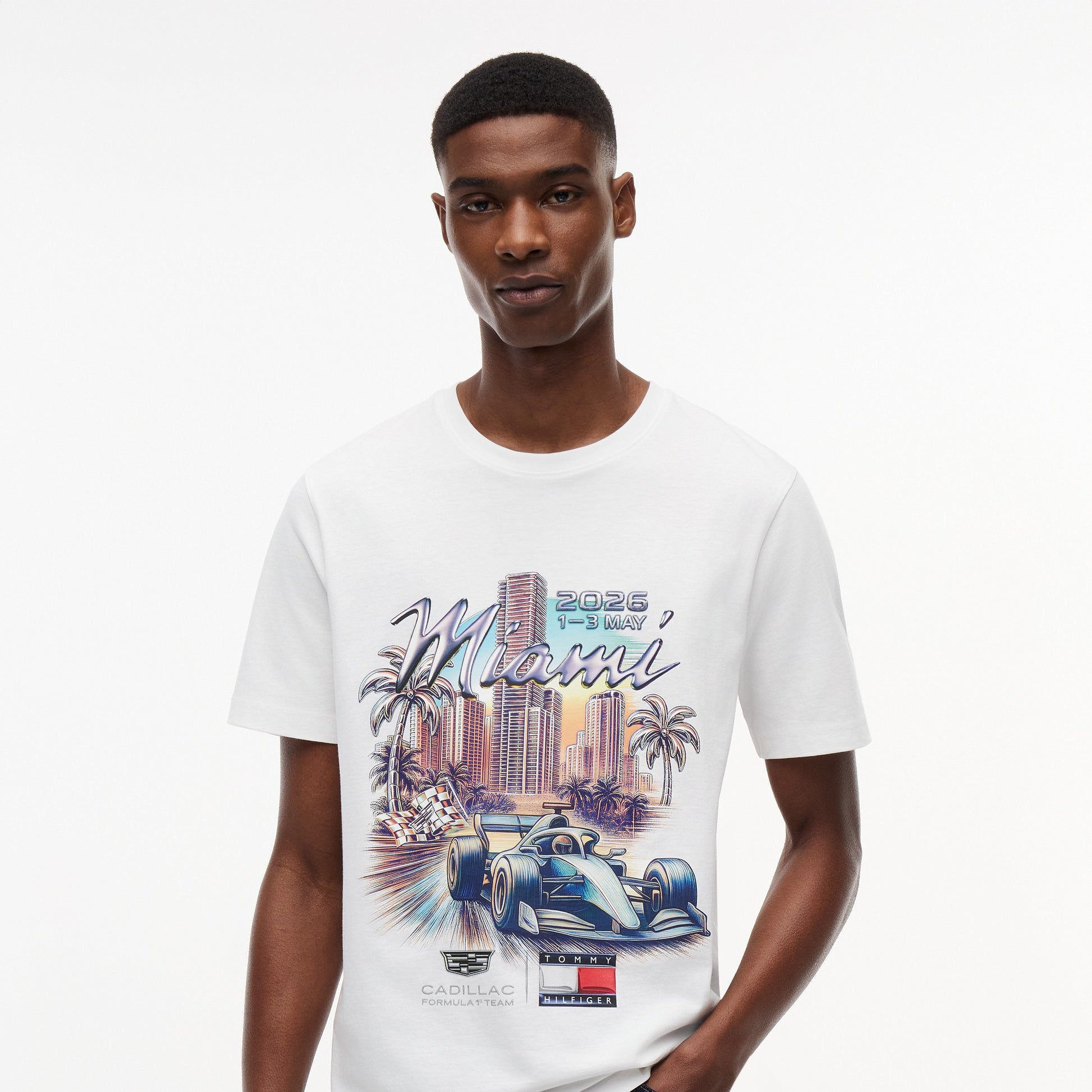 Celebrate American motorsport style with the Cadillac F1 x Tommy Hilfiger Miami Graphic Tee for Men in classic white. Part of the official fanwear collection from the Tommy Hilfiger x Cadillac Formula 1 Team — blending high-speed American racing heritage with iconic fashion design.
