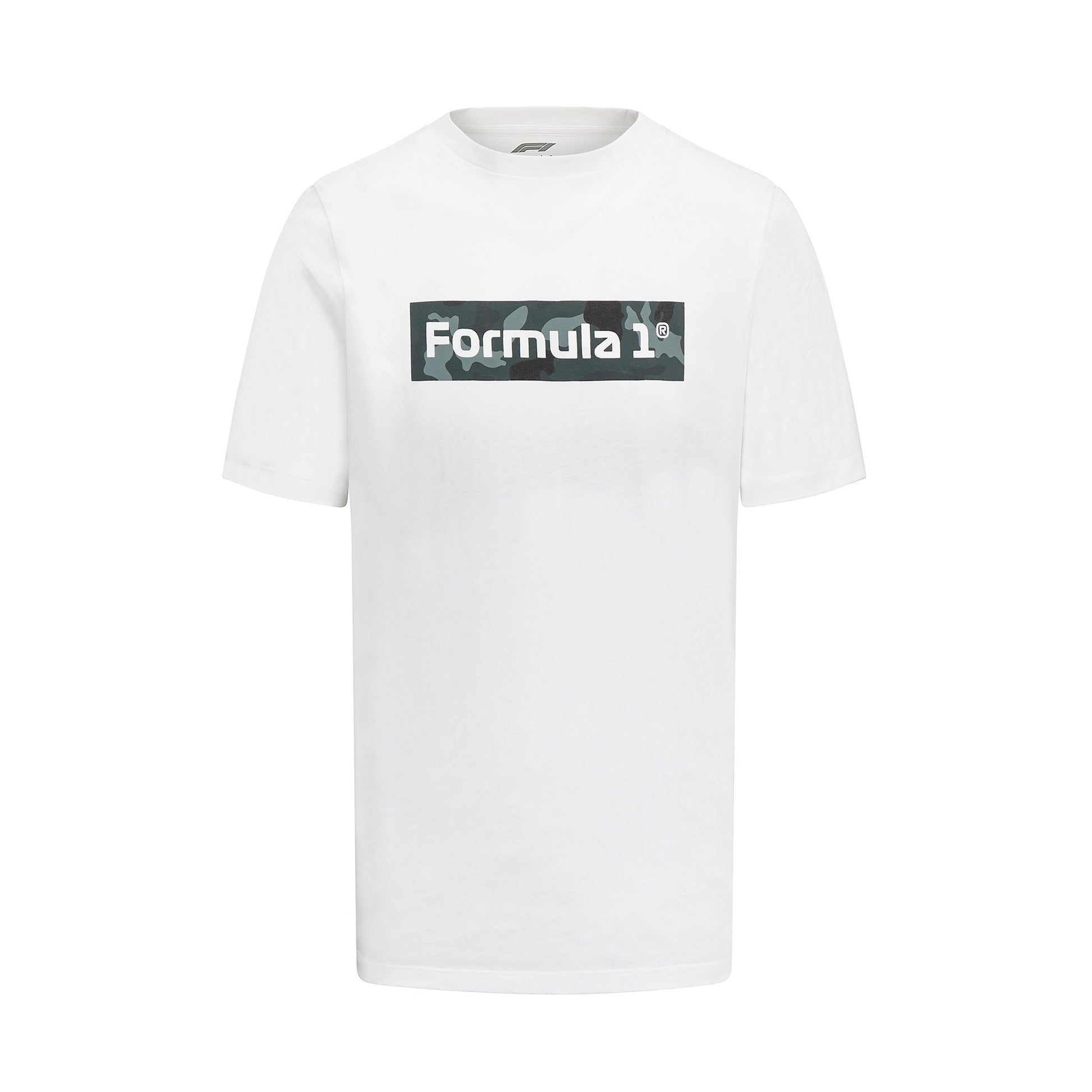 Classic white tee with Camouflage Formula 1 Box logo design on the front and a large '1' on the rear. Cool.