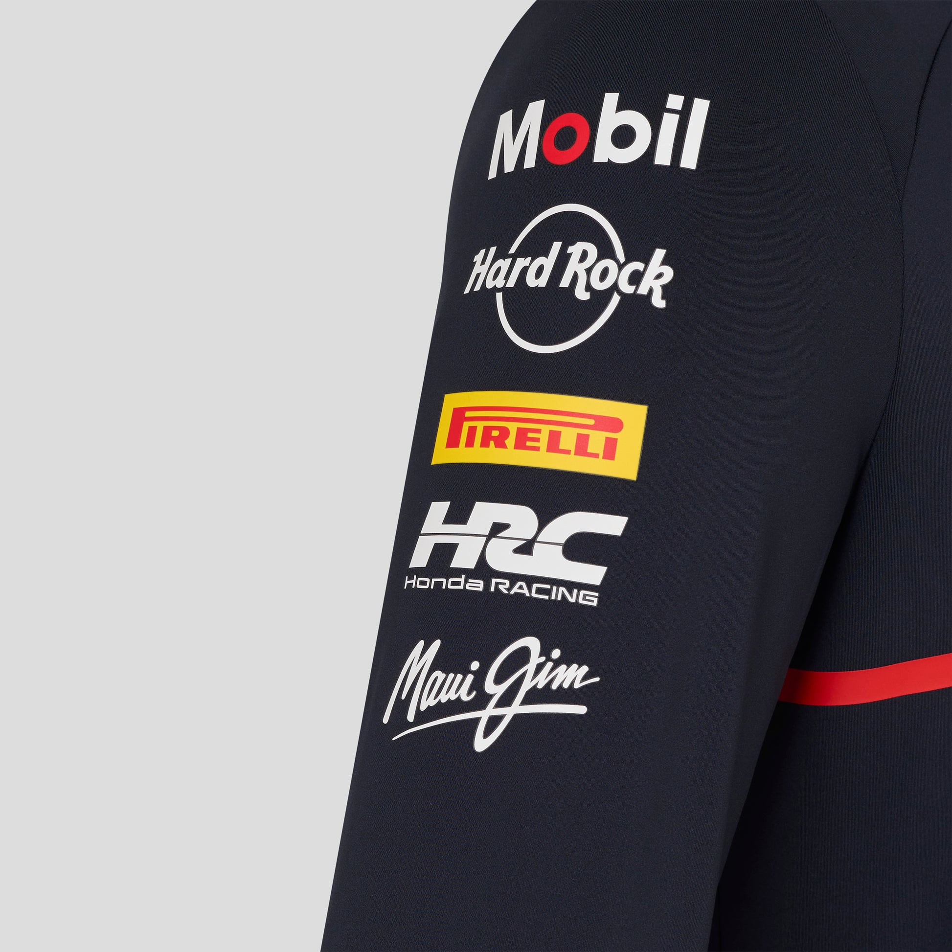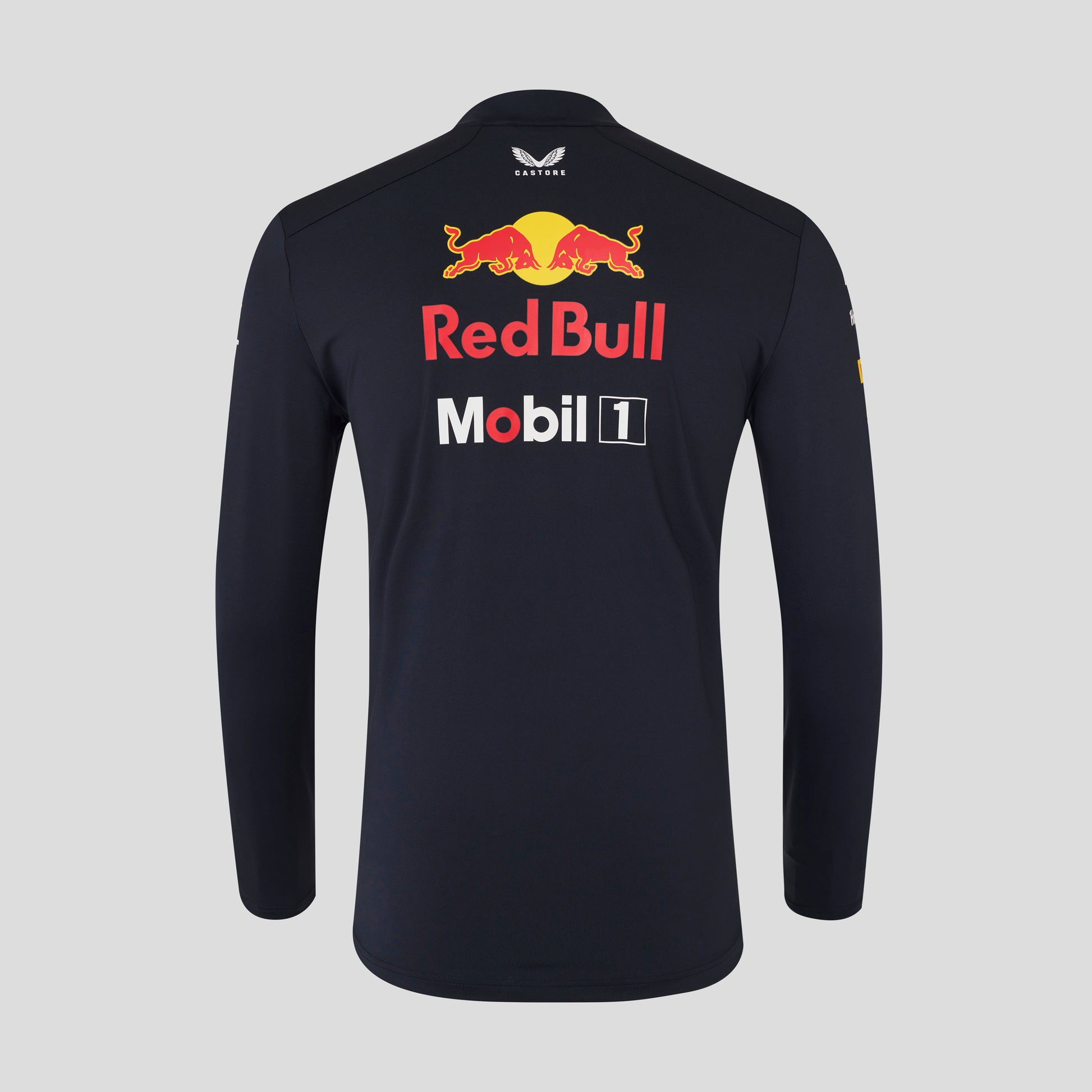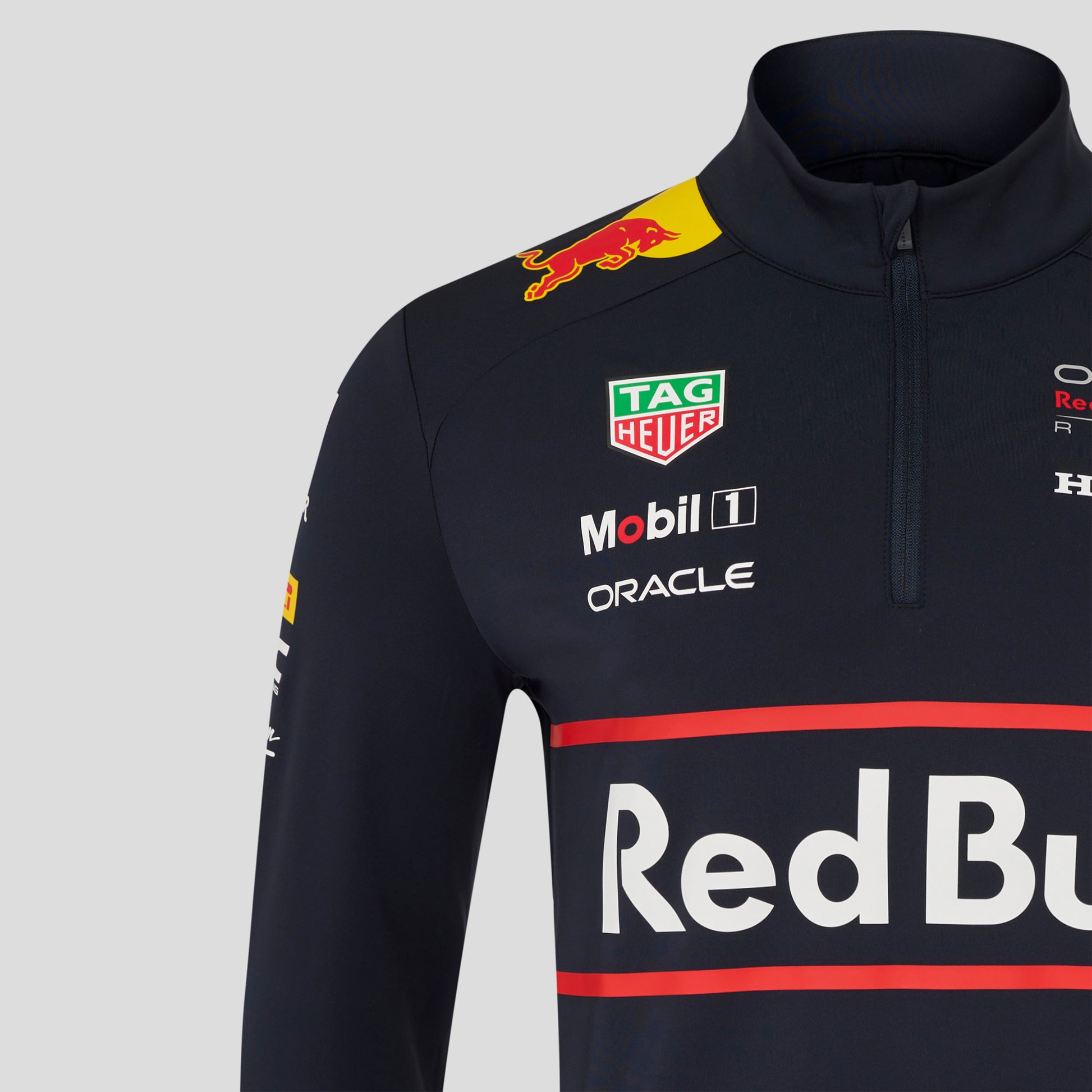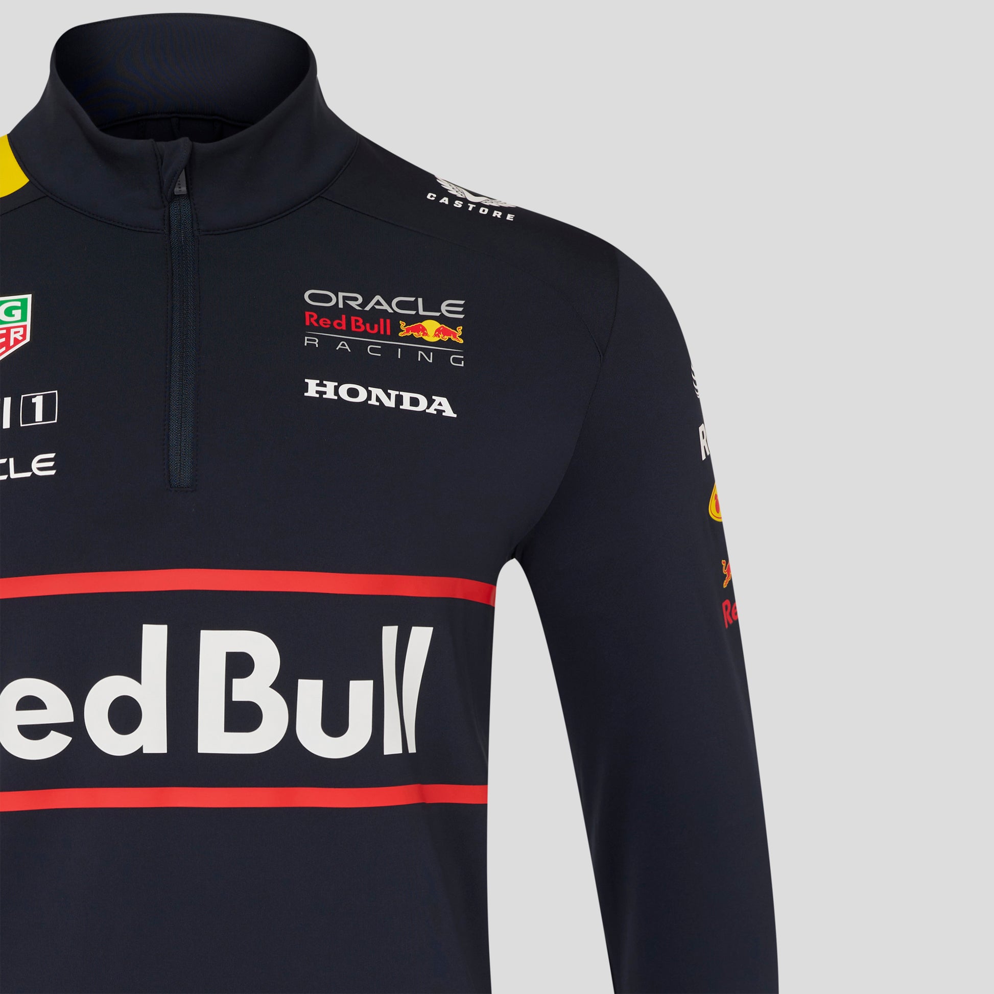 Adults Oracle Red Bull Replica 1/4 Zip Midlayer. Unisex quarter zip mid layer featuring the Red Bull team banner, ORBR team Logo and team sponsors. The back of the garment features the iconic charging Bulls logo. In night sky