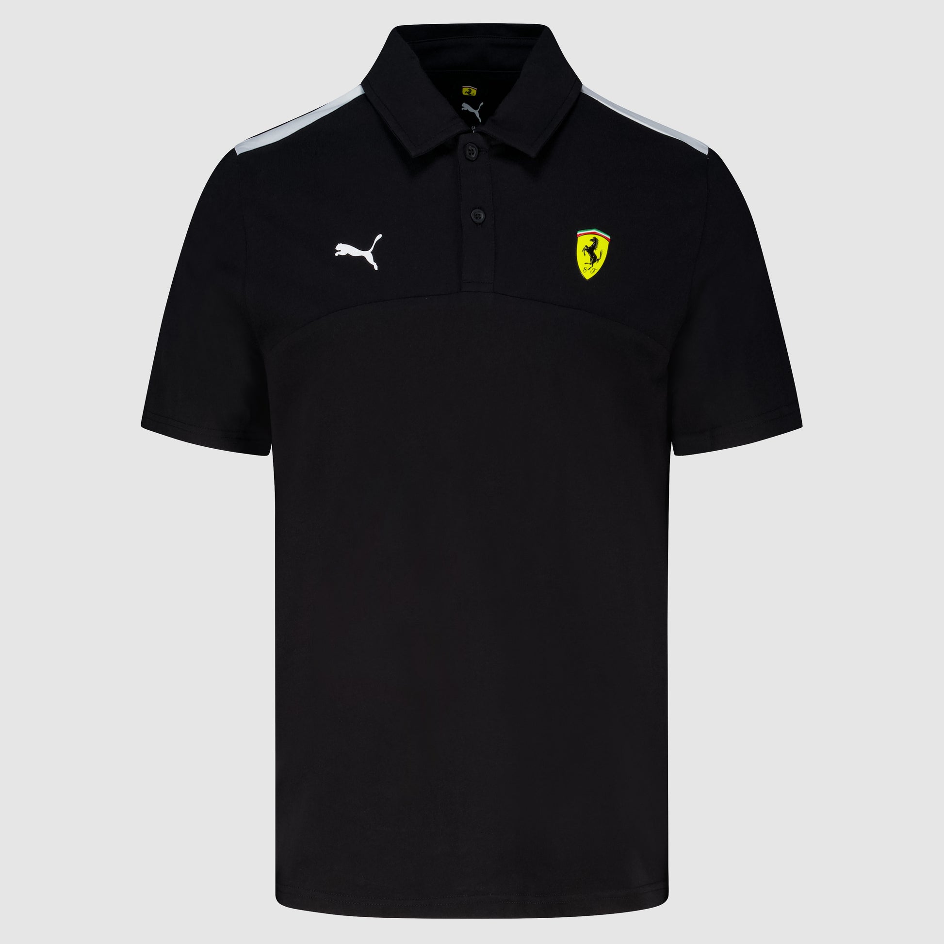 Ferrari F1 Fanwear Polo Shirt. Elegant Ferrari Polo Shirt with Scudetto Shield logo and white panel shoulders. Available in black or cherry red and made from 100% cotton.