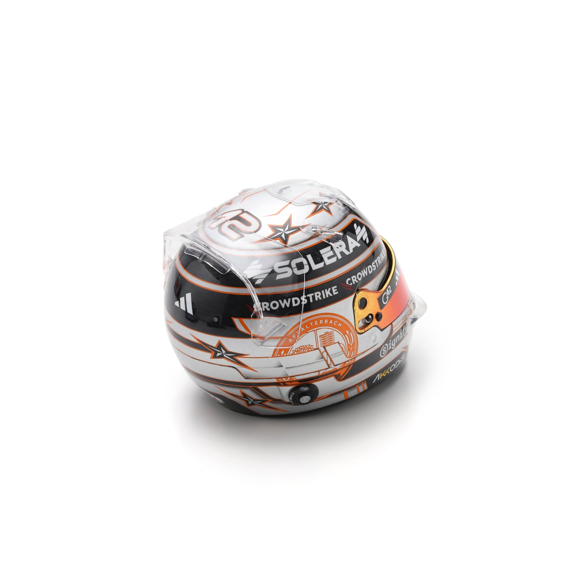 Spark 1:5 resin model of the Kimi Antonelli Mercedes helmet from the 2025 British Grand Prix. Antonelli ran a one-off Grey and Gold design in this race. He secured his first Pole at the Sprint Race, looking to kick start his career in F1.The following day he placed seventh in the main race.